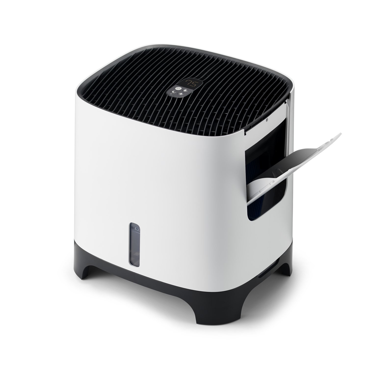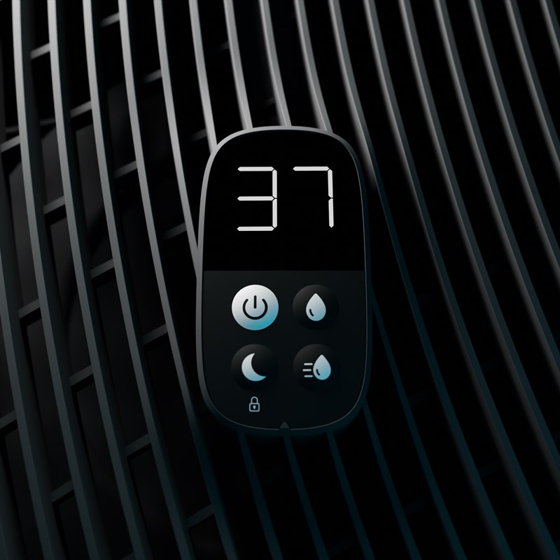 • Inteligentné zvlhčovanie – vstavaný hygrostat umožňuje nastaviť cieľovú vlhkosť medzi 40 a 70 % v krokoch po 5 %. Po dosiahnutí zadanej hodnoty sa zvlhčovanie automaticky vypne. Každých 30 minút sa spustí ventilátor a skontroluje úroveň vlhkosti. Ak sa zistená hodnota zníži o 3 % oproti cieľovej hodnote, zvlhčovanie sa opäť zapne.